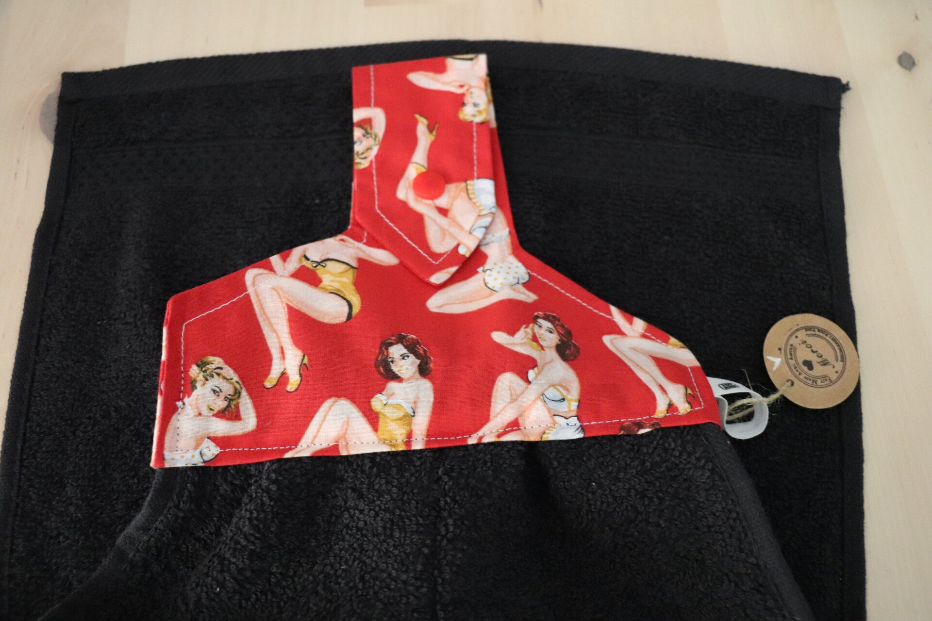 Essuie mains en coton Rouge avec des pin up et une éponge de coton Noire.