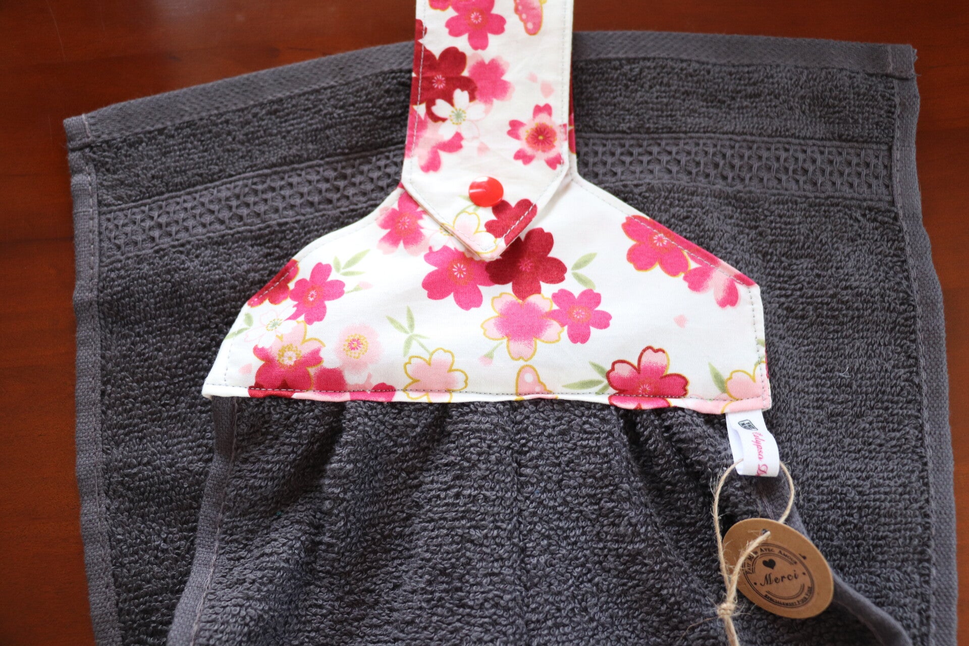 Essuie mains en coton imprimé fleurs et une éponge de coton grise.
