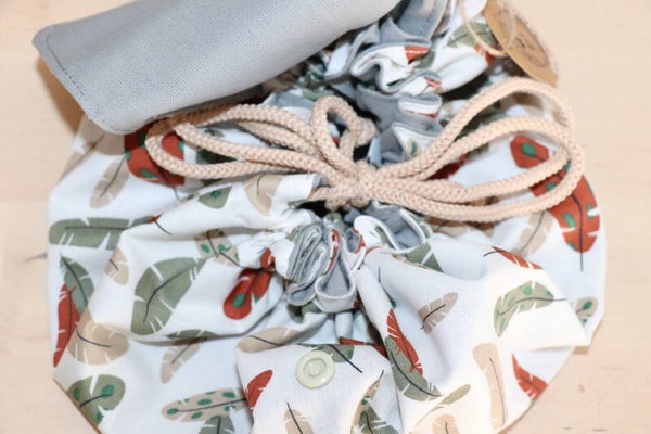 Composition : Tissus en coton Oeko-tex, cordon en polyester et bouton pression.