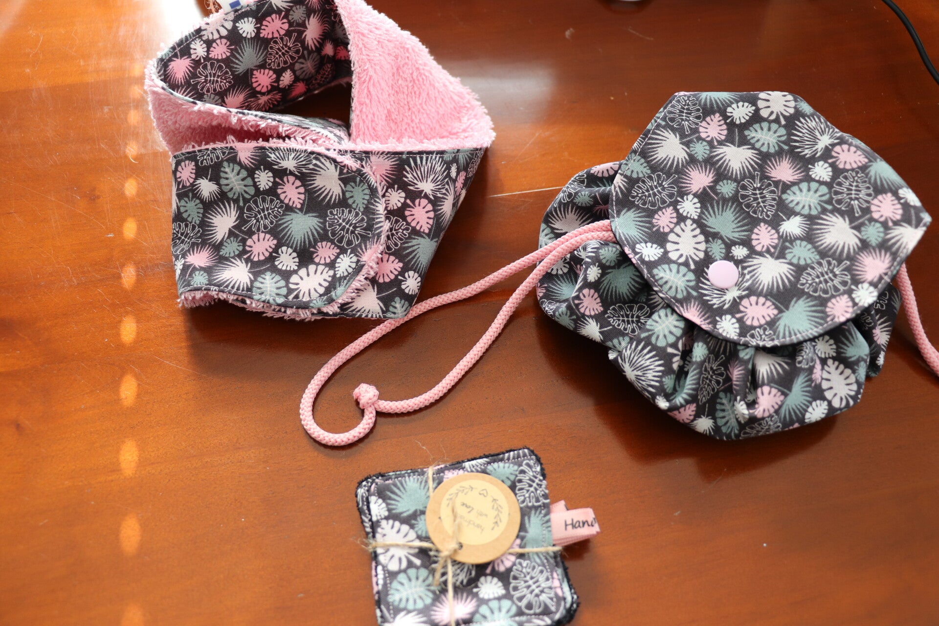 * La  Trousse à maquillage: doublée d'un coton Noir, avec un cordon Rose.