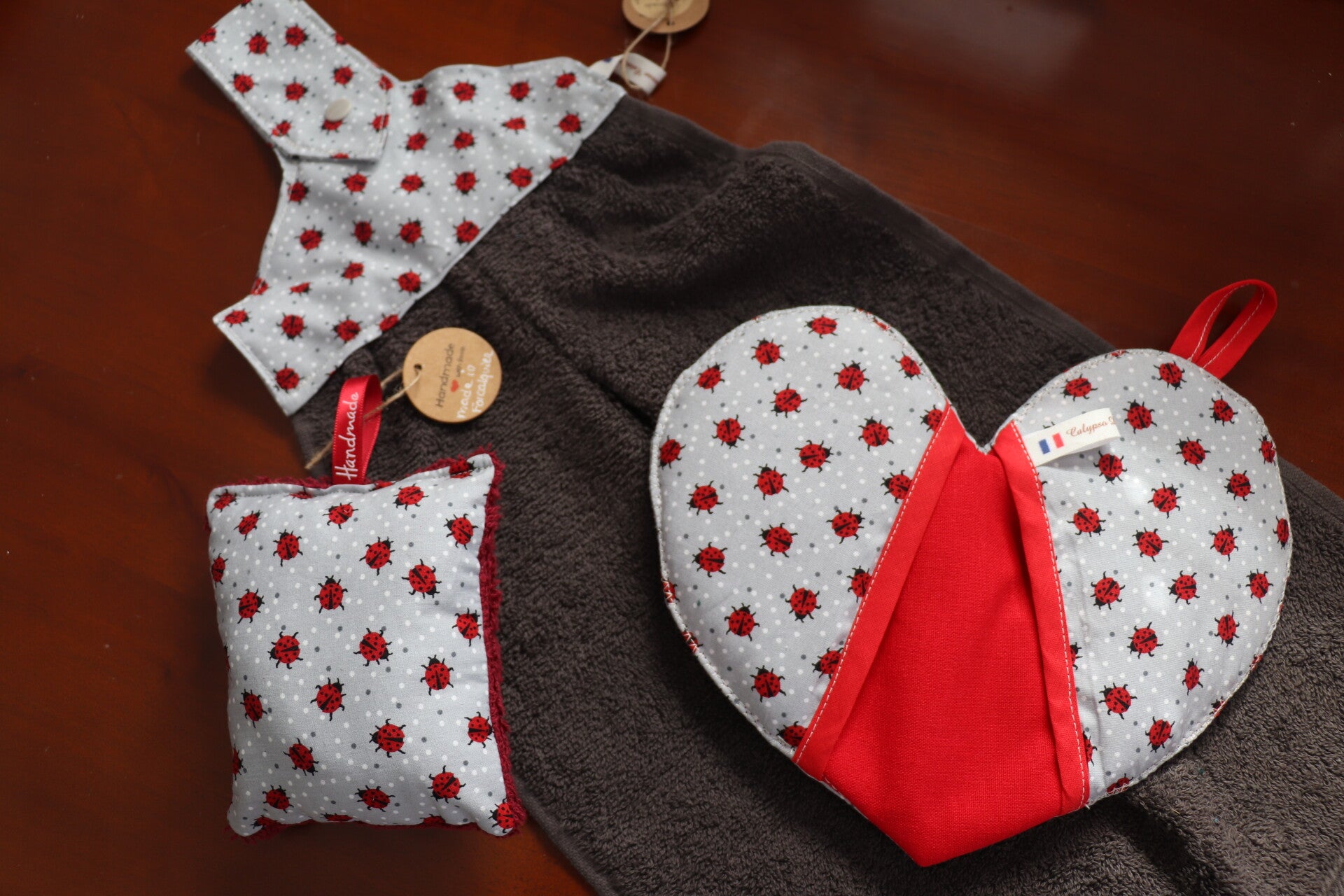 Essuie mains en coton imprimé coccinelles et une éponge de coton marron ou noire.