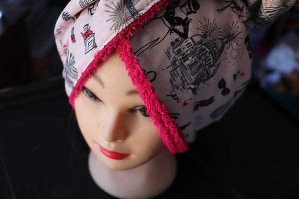 Très stylé, ce turban en tissu rose imprimé Paris est doublé d'une éponge de coton de couleur Fushia vous accompagnera partout en toute élègance.