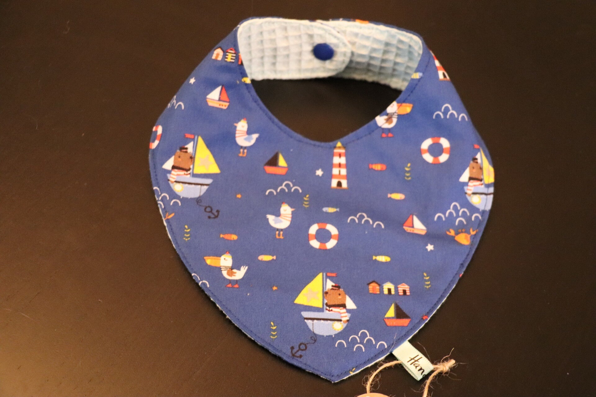 Bavoir bandana bleu marine aux motifs marins, doublé d'un nid d'abeille menthe . Il est réversible.