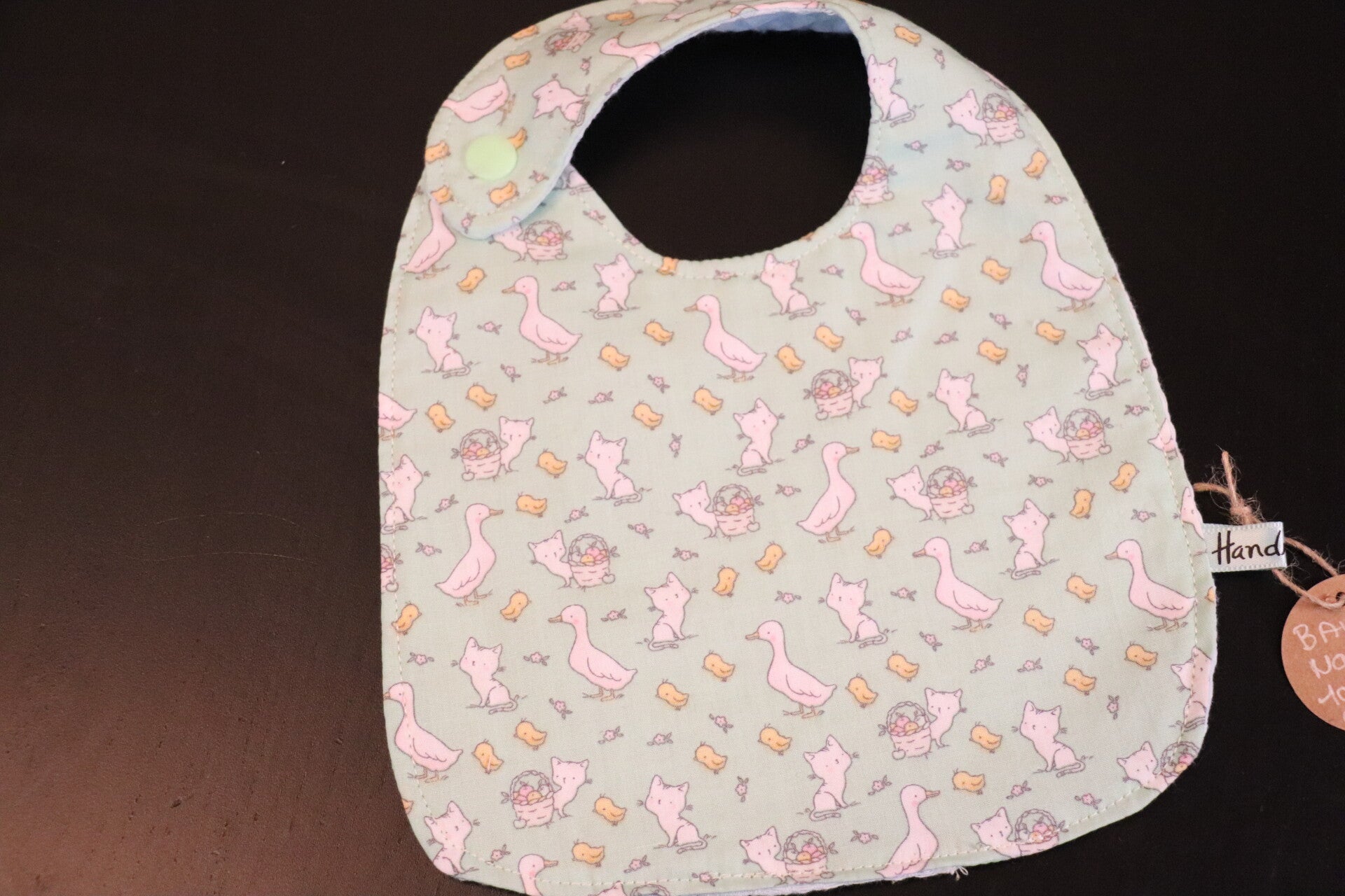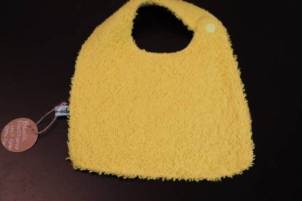 Bavoir classique vert doublé d'un nid d'abeille mint ou d'une éponge de coton jaune. Il est réversible et se ferme par un bouton pression.