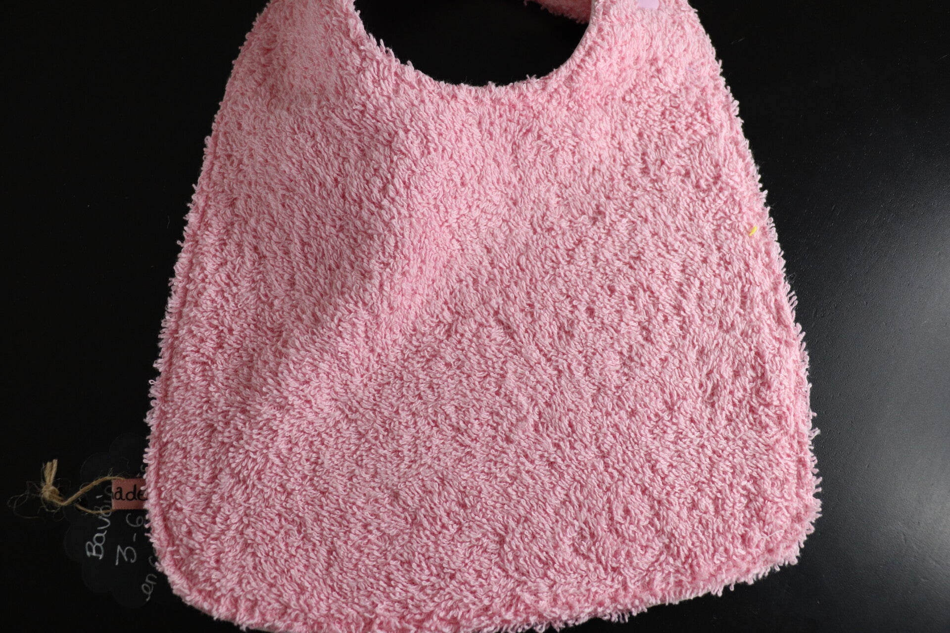 Bavoir classique rose doublé d'une éponge de coton Rose. Il est réversible et se ferme par un bouton pression.