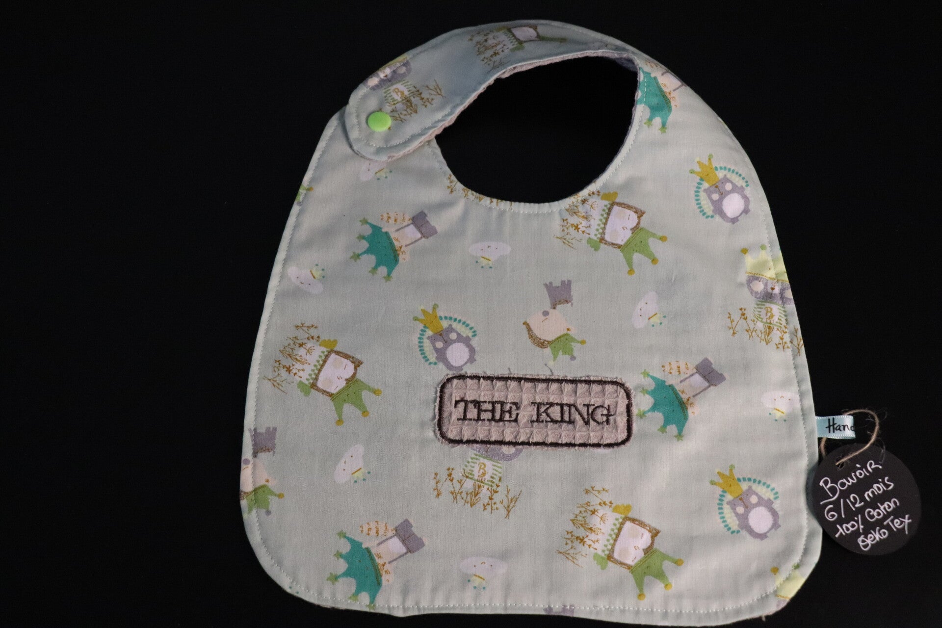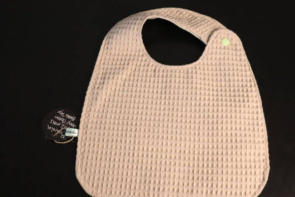 Bavoir classique brodé vert tendre doublé d'un nid d'abeille de coton beige. Il est réversible et se ferme par un bouton pression.