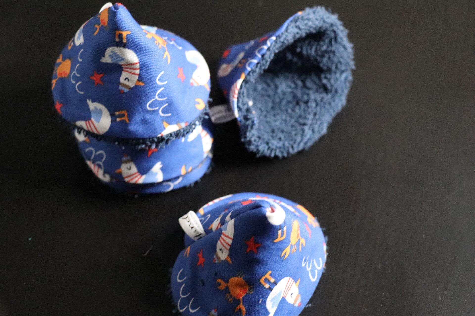 Petit cône en éponge de coton bleu marine et coton imprimé pour contenir l'accident lors du change.