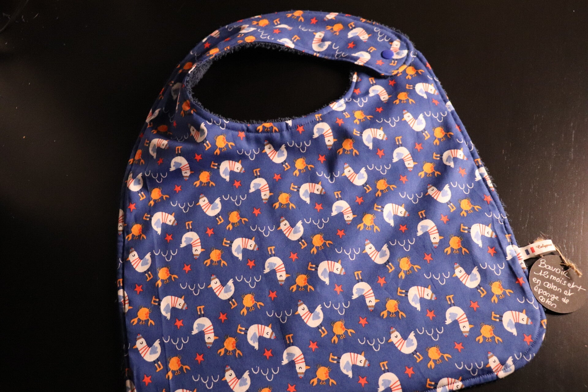 Bavoir classique bleu marine doublé d'une éponge de coton bleu marine. Il est réversible et se ferme par un bouton pression.