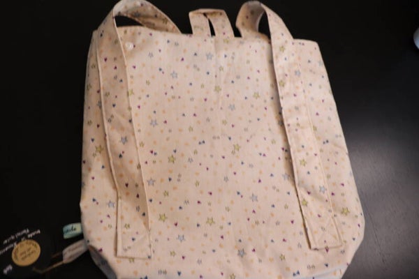 Sac à dos en coton aux motifs étoiles doublé d'un coton beige, avec une poche devant et se ferme par un bouton pression.