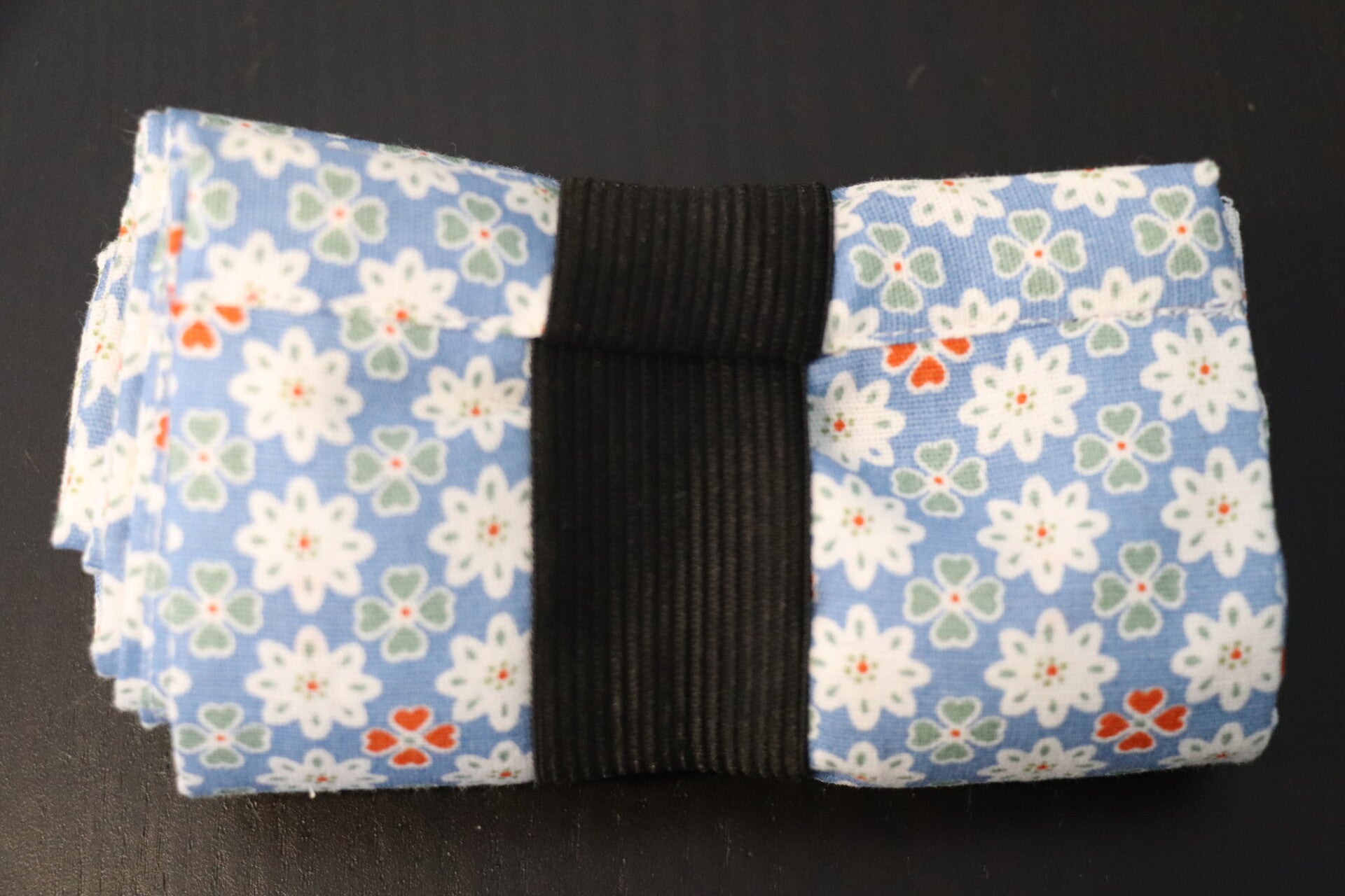 Composition : Coton Oeko-tex , sangle en polyester pour les anses, un bouton pression et un élastique.